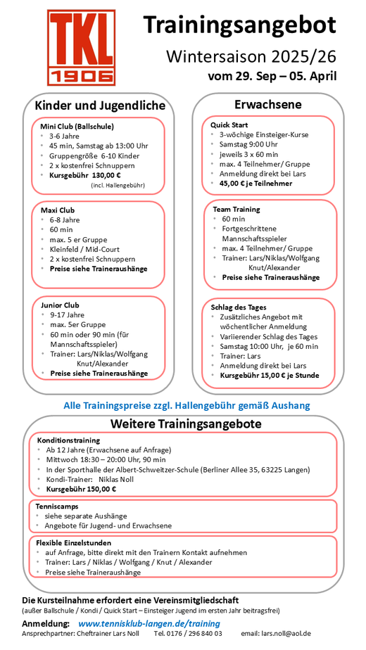 Jeder unserer Trainer bietet sowohl Anfängern für den Einstieg als auch hochrangigen Mannschaftsspieler/-innen für den Klassenaufstieg und -erhalt ein perfekt abgestimmtes Trainingsprogramm. Unterstützung liefern mehrere Assistenz- und C-Trainer, die vom Schnupperkurs bis zum Leistungskadertraining vielseitig einsetzbar sind. Tennis-Camps in den Oster- und Sommerferien für Jugendliche und Erwachsene runden das Trainingsangebot ab. Mehr dazu unter Termine!